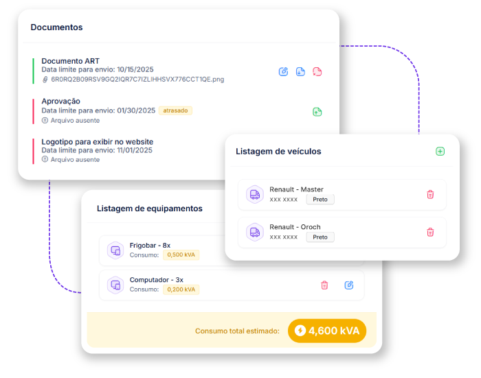 - Upload de logos, ART, seguro, termos, comunicações visuais