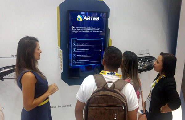 Os participantes acessam o quiz por tablet, totem ou celular, respondem às questões e recebem uma pontuação de acordo com seu desempenho.